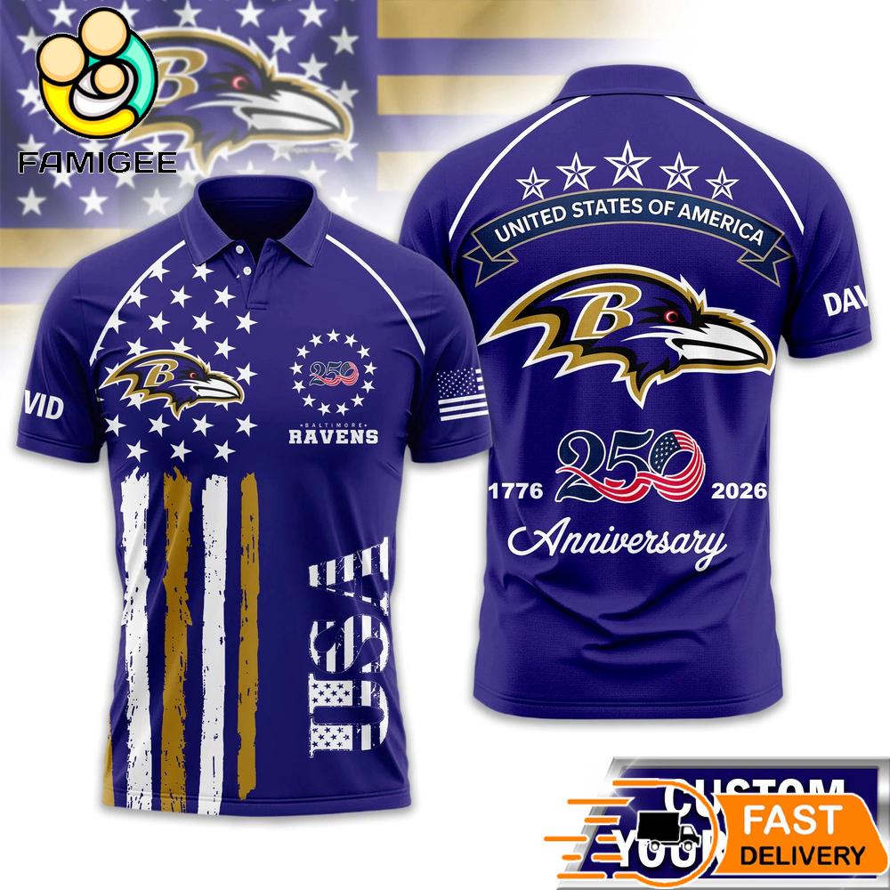 Baltimore Ravens 250 Years Of Freedom USA Vintage Custom Name Polo Shirt Designed for loyal fans of the [thien_display_tags], this standout polo blends classic style with a powerful tribute to 250 years of American freedom.