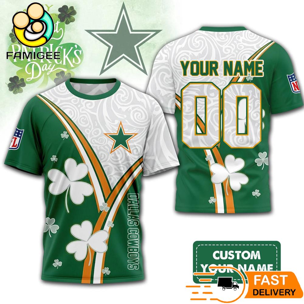 Custom Dallas Cowboys Lucky Clover Green T-Shirt Celebrate Saint Patrick’s Day with this special edition NFL fan shirt. Featuring lucky shamrock graphics, vibrant green color, and a sporty design that stands out. Customize it with your own name and number. Comfortable and stylish—perfect for game day, everyday wear, or as a unique gift for NFL fans.