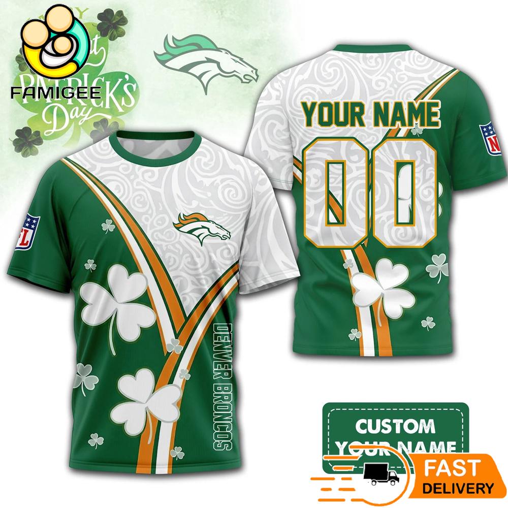 Custom Denver Broncos Lucky Clover Green T-Shirt Celebrate Saint Patrick’s Day with this special edition NFL fan shirt. Featuring lucky shamrock graphics, vibrant green color, and a sporty design that stands out. Customize it with your own name and number. Comfortable and stylish—perfect for game day, everyday wear, or as a unique gift for NFL fans.