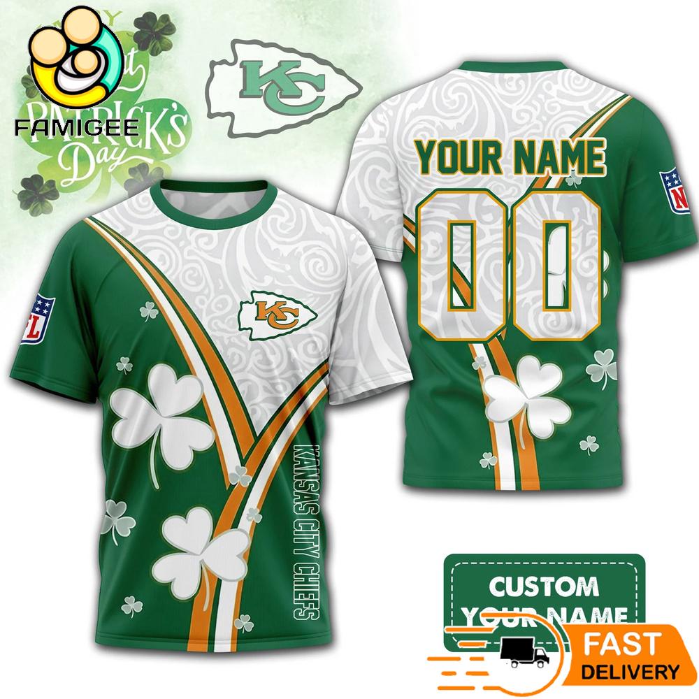 Custom Kansas City Chiefs Lucky Clover Green T-Shirt Celebrate Saint Patrick’s Day with this special edition NFL fan shirt. Featuring lucky shamrock graphics, vibrant green color, and a sporty design that stands out. Customize it with your own name and number. Comfortable and stylish—perfect for game day, everyday wear, or as a unique gift for NFL fans.