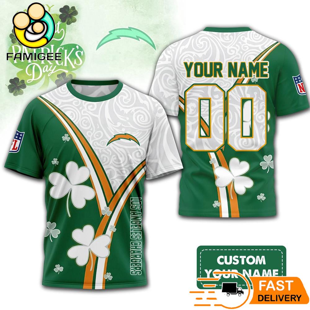 Custom Los Angeles Chargers Lucky Clover Green T-Shirt Celebrate Saint Patrick’s Day with this special edition NFL fan shirt. Featuring lucky shamrock graphics, vibrant green color, and a sporty design that stands out. Customize it with your own name and number. Comfortable and stylish—perfect for game day, everyday wear, or as a unique gift for NFL fans.