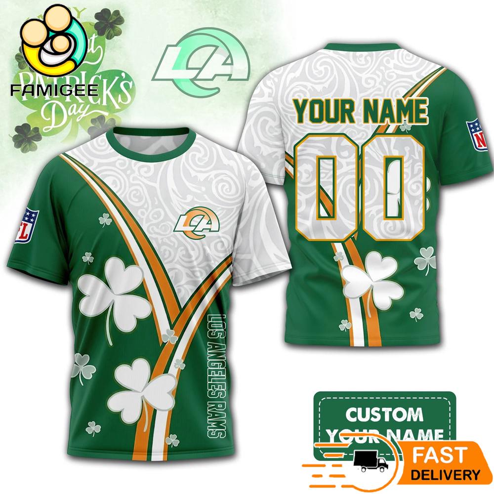 Custom Los Angeles Rams Lucky Clover Green T-Shirt Celebrate Saint Patrick’s Day with this special edition NFL fan shirt. Featuring lucky shamrock graphics, vibrant green color, and a sporty design that stands out. Customize it with your own name and number. Comfortable and stylish—perfect for game day, everyday wear, or as a unique gift for NFL fans.