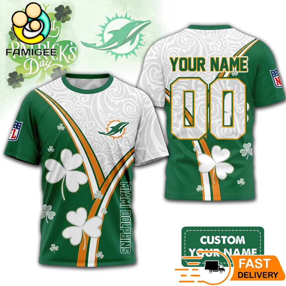 Custom Miami Dolphins Lucky Clover Green T-Shirt Celebrate Saint Patrick’s Day with this special edition NFL fan shirt. Featuring lucky shamrock graphics, vibrant green color, and a sporty design that stands out. Customize it with your own name and number. Comfortable and stylish—perfect for game day, everyday wear, or as a unique gift for NFL fans.