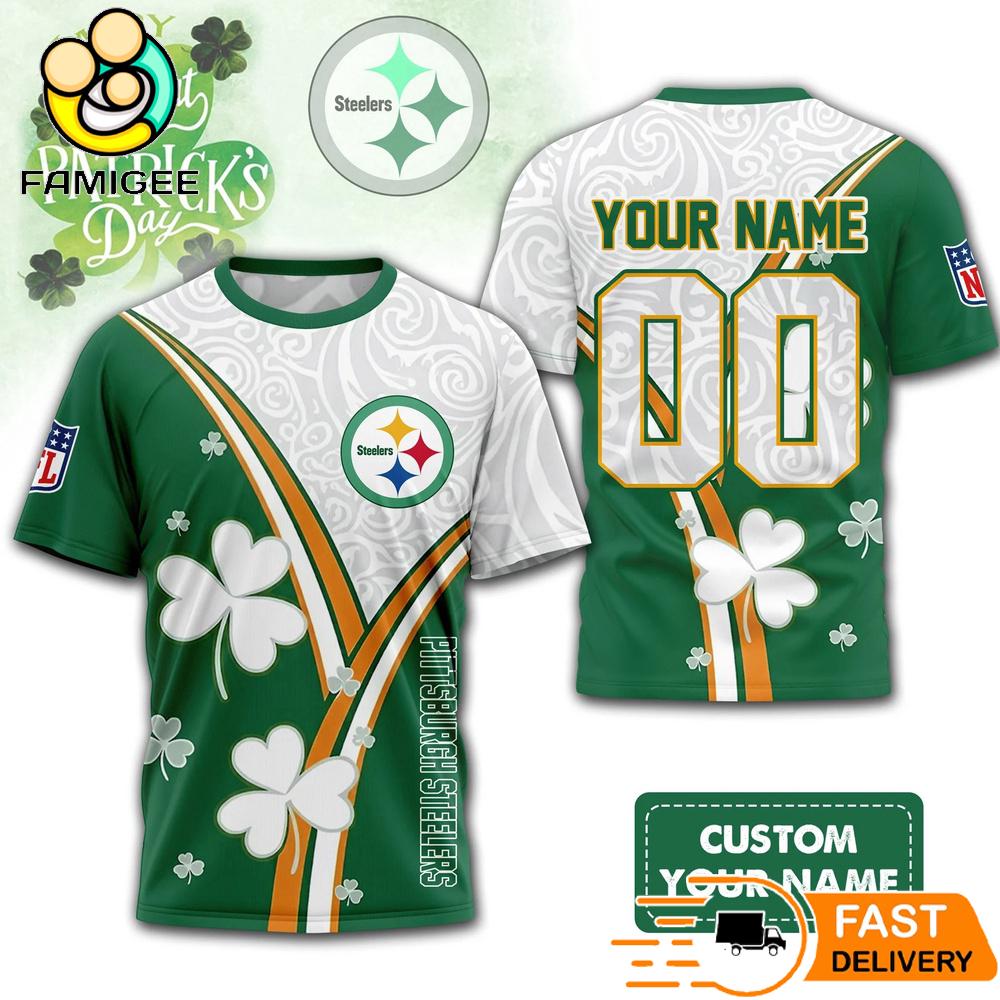 Custom Pittsburgh Steelers Lucky Clover Green T-Shirt Celebrate Saint Patrick’s Day with this special edition NFL fan shirt. Featuring lucky shamrock graphics, vibrant green color, and a sporty design that stands out. Customize it with your own name and number. Comfortable and stylish—perfect for game day, everyday wear, or as a unique gift for NFL fans.