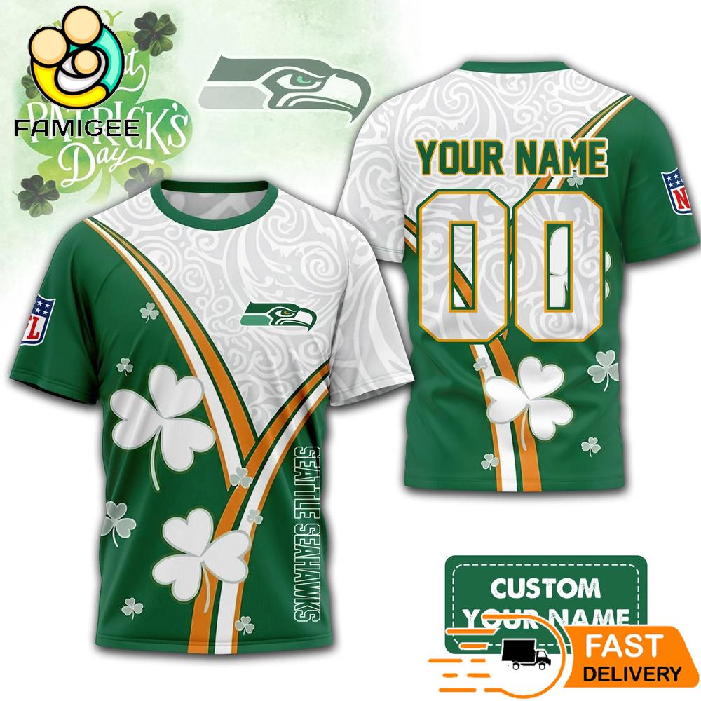 Custom Seattle Seahawks Lucky Clover Green T-Shirt Celebrate Saint Patrick’s Day with this special edition NFL fan shirt. Featuring lucky shamrock graphics, vibrant green color, and a sporty design that stands out. Customize it with your own name and number. Comfortable and stylish—perfect for game day, everyday wear, or as a unique gift for NFL fans.