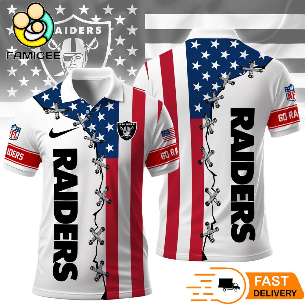 Las Vegas Raiders Independence Day American Flag Polo Shirt designed for passionate fans of the National Football League who want to stand out during the most patriotic time of the year. Inspired by the bold colors of the American flag, this eye catching polo blends team spirit with national pride, making it the perfect outfit for summer celebrations and game day gatherings.