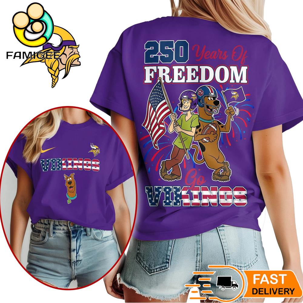 Minnesota Vikings Scooby Doo 250 Years Of Freedom T-Shirt a must-have for every true fan. This unique design blends the iconic Minnesota Vikings spirit with a fun Scooby Doo twist, creating a standout piece perfect for game day, holidays, or everyday wear.