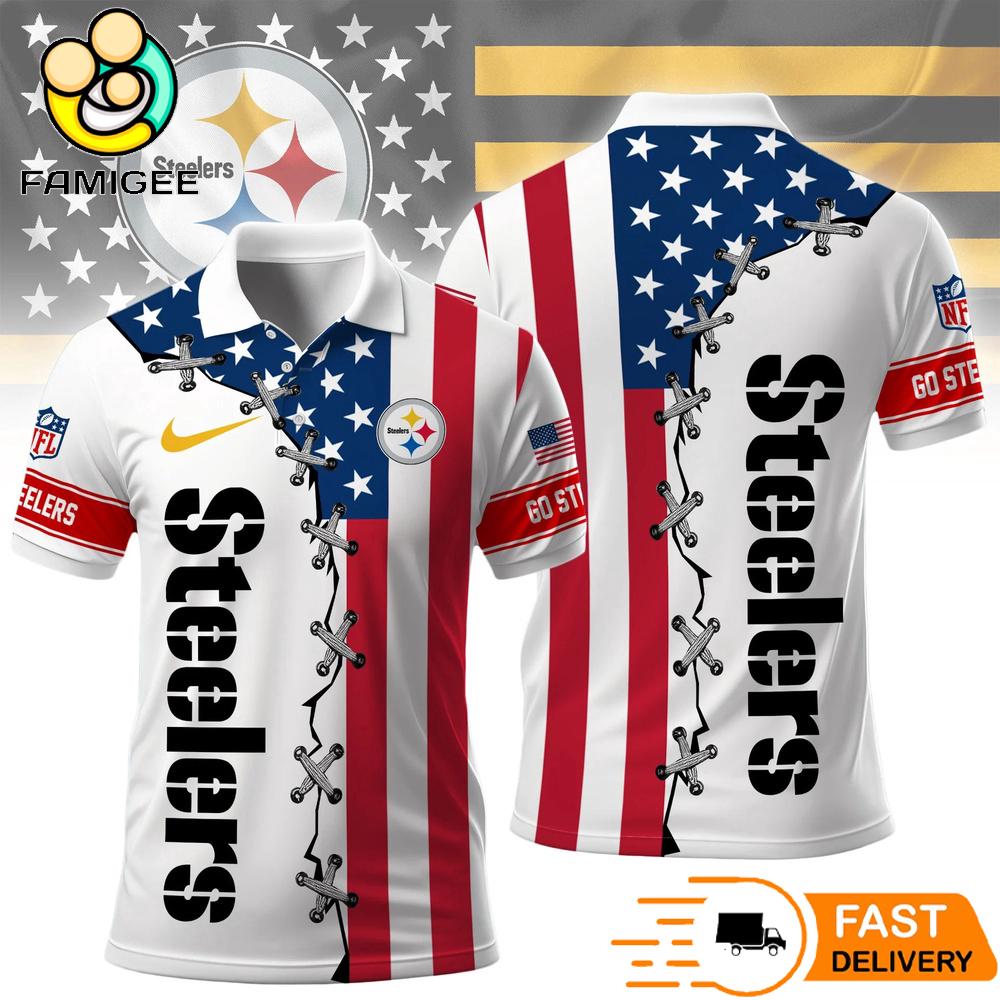 Pittsburgh Steelers Independence Day American Flag Polo Shirt designed for passionate fans of the National Football League who want to stand out during the most patriotic time of the year. Inspired by the bold colors of the American flag, this eye catching polo blends team spirit with national pride, making it the perfect outfit for summer celebrations and game day gatherings.