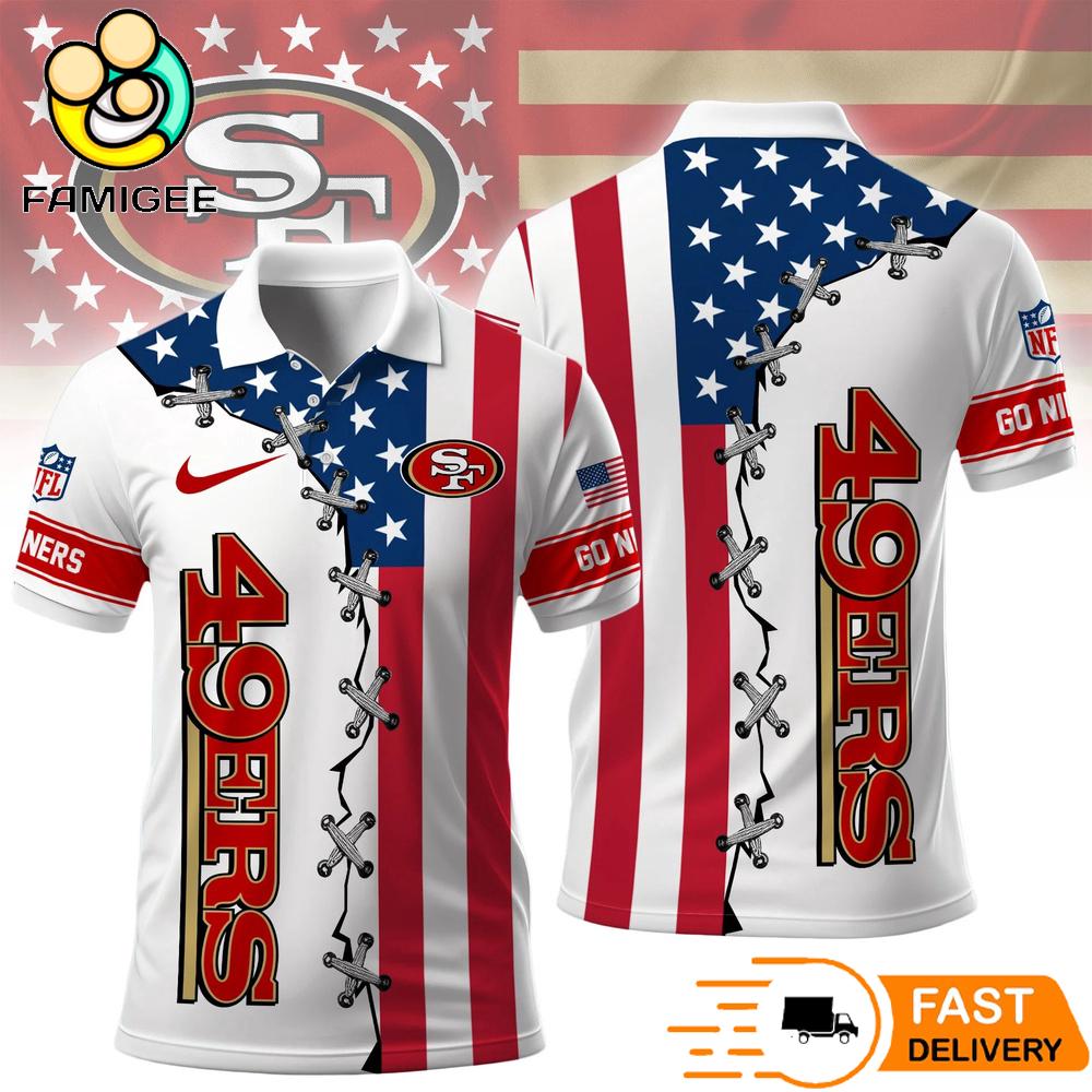 San Francisco 49ers Independence Day American Flag Polo Shirt designed for passionate fans of the National Football League who want to stand out during the most patriotic time of the year. Inspired by the bold colors of the American flag, this eye catching polo blends team spirit with national pride, making it the perfect outfit for summer celebrations and game day gatherings.
