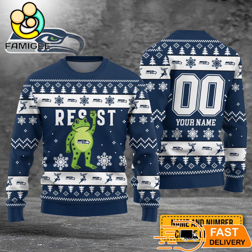 Seattle Seahawks NFL Resist Frog Ugly Christmas Sweater a must have for the festive season. Designed to bring laughter and joy, this sweater is perfect for Christmas parties, family gatherings, or as a fun holiday gift. With bright colors, eye catching patterns, and a comfortable fit, it’s the ultimate way to show off your Christmas cheer. Whether you’re joining an ugly sweater contest or just want to spread some festive vibes, this piece will make you stand out in the best way. Celebrate the holidays with a sweater that’s cozy, stylish, and full of Christmas fun.